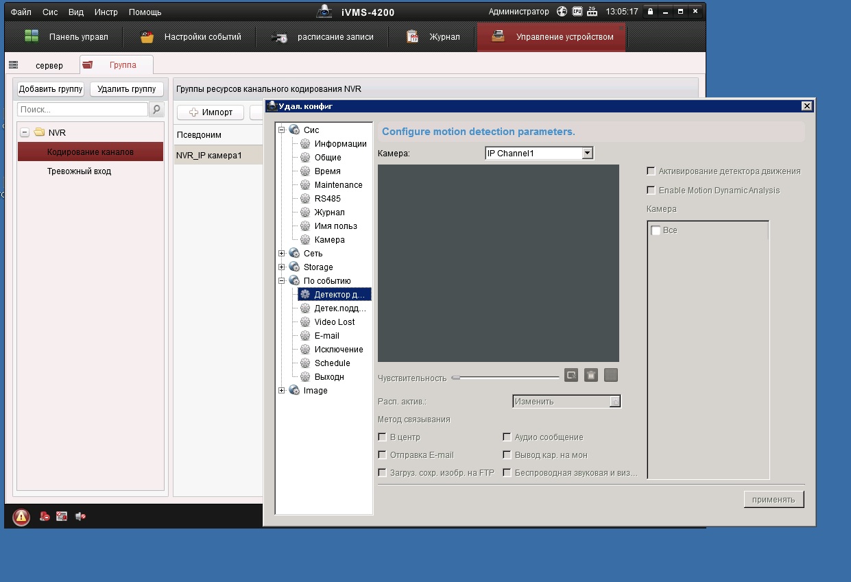 IVMS 4200 видит NVR и камеру в нем. отдельно камеру не получилось прикрутить. Настройки детектора недоступны